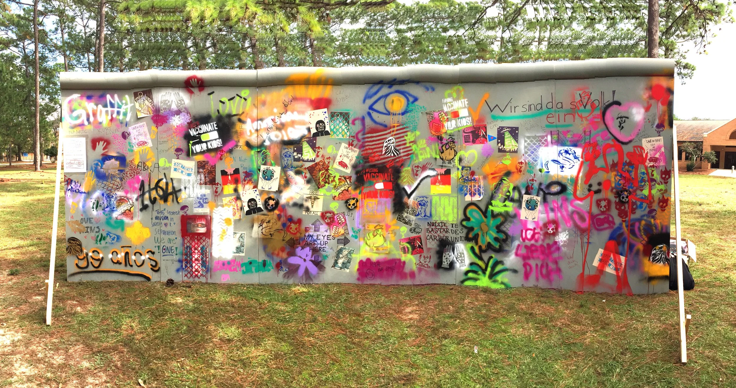 Mock Berlin Wall, Intro to Screen Print, Woodcut and Conceptual Drawing, Wheatpasted Protest/Propaganda Posters and Hand-Cut Stencils, Sizes vary, 2019, University of South Alabama