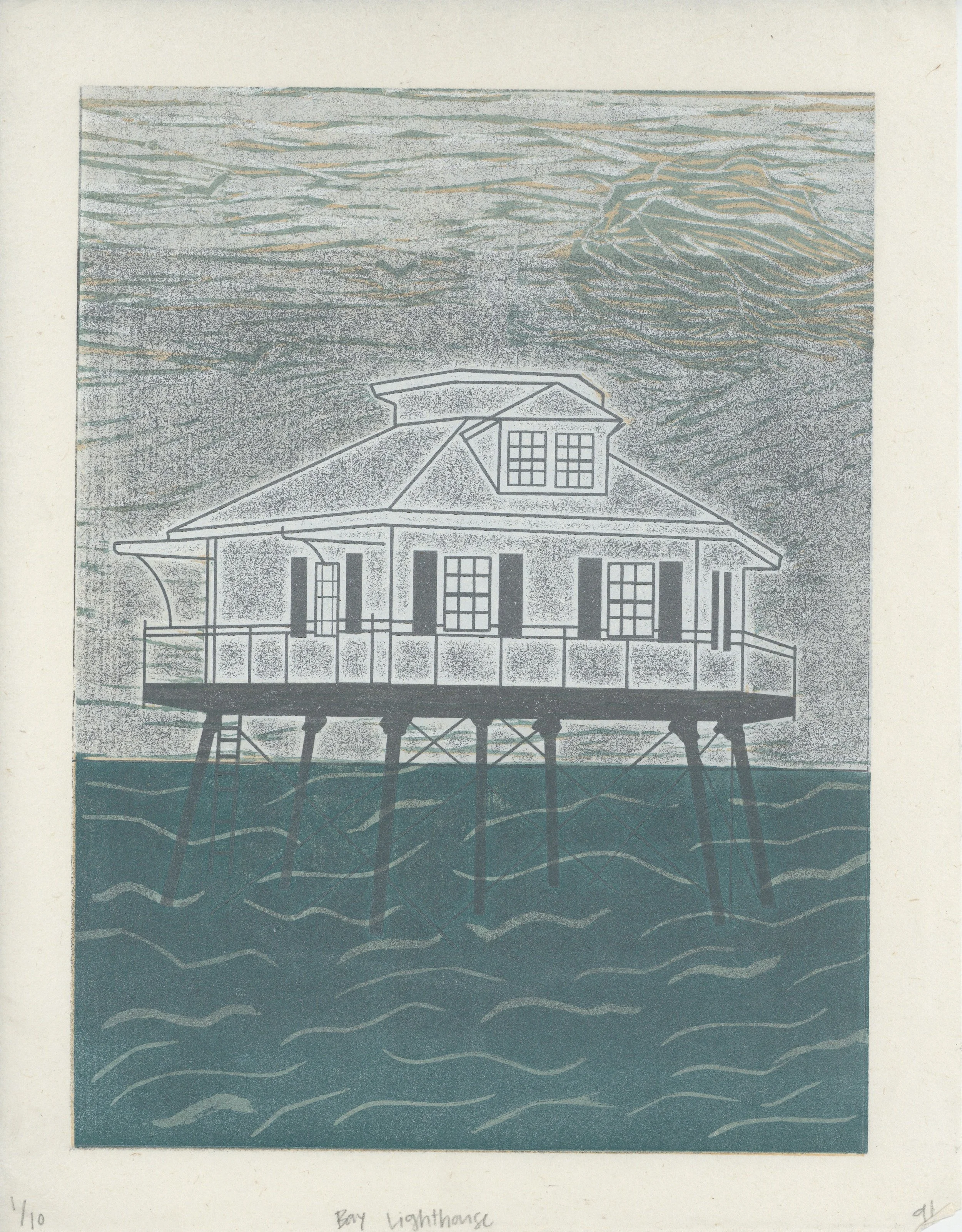 Bay Lighthouse, Relief/ Woodcut, Lower Alabama, 5-Layer Reductive Block with Laser-Engraved Keyline, 9” x 12”, 2019, University of South Alabama